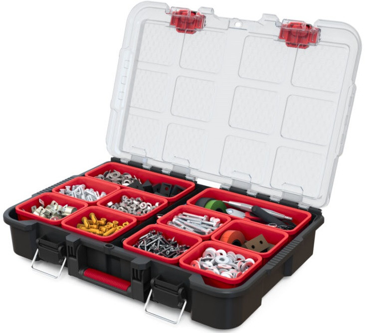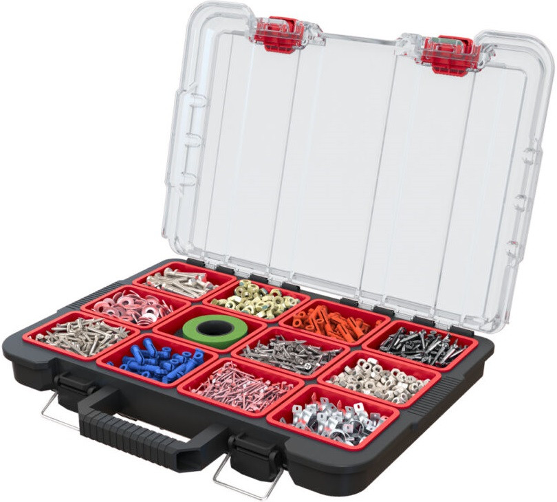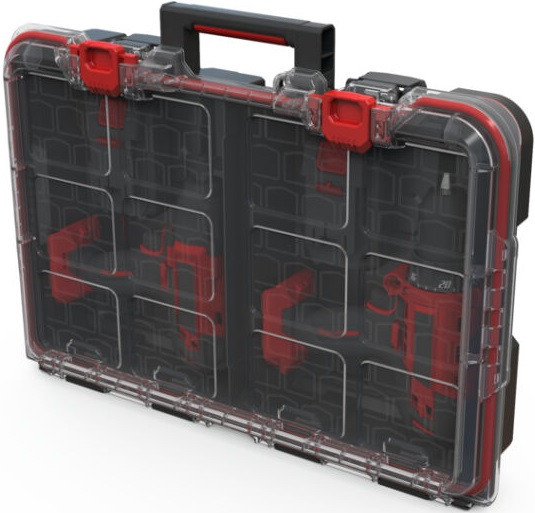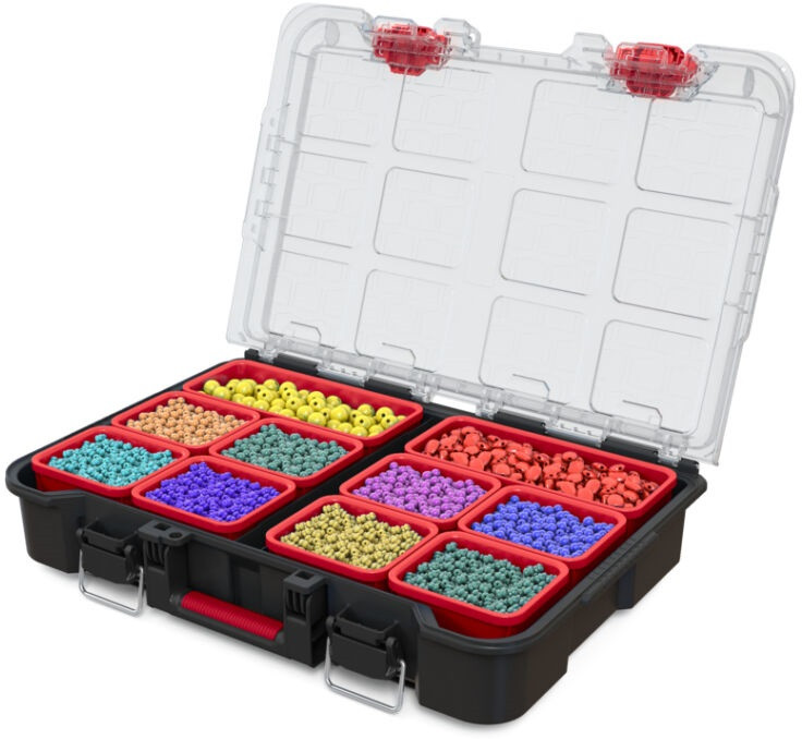 Ha egy sokoldalú rendszerezőre van szükséged apró alkatrészekhez, akkor a Stack'N'Roll termékcsalád termékét neked találták ki! A rendszerező két kivehető tárolóval rendelkezik a barkácsoláshoz szükséges alkatrészek és kiegészítők rendezett tárolása érdekében. A rekeszek mérete testre szabható, de akár el is távolíthatók a nagyobb méretű szerszámok tárolását segítve. Átlátszó tetejének köszönhetően a benne tárolt tárgyak folyamatosan láthatók maradnak. Kézreálló fogantyújának köszönhetően egyszerűen szállítható, fém csatja pedig megakadályozza a tető véletlen kinyílását. A termék kompatibilis a Stack'N'Roll termékcsalád többi termékével.