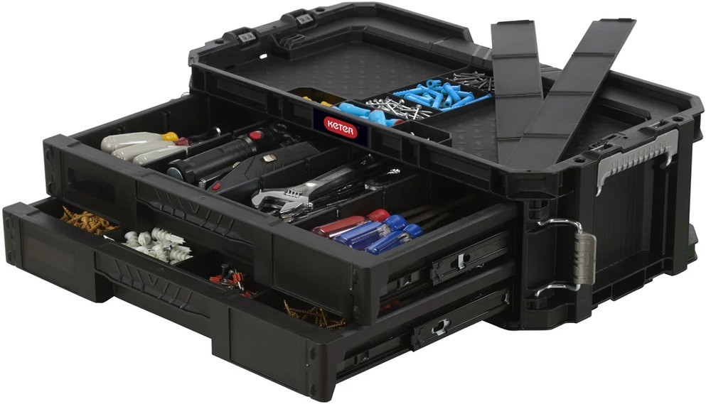 Kiváló választás hobbi- és profi barkácsolók számára, 2 fiókja teljesen kihúzható, aminek köszönhetően egyszerűen és gyorsan hozzá lehet férni a szerszámokhoz.