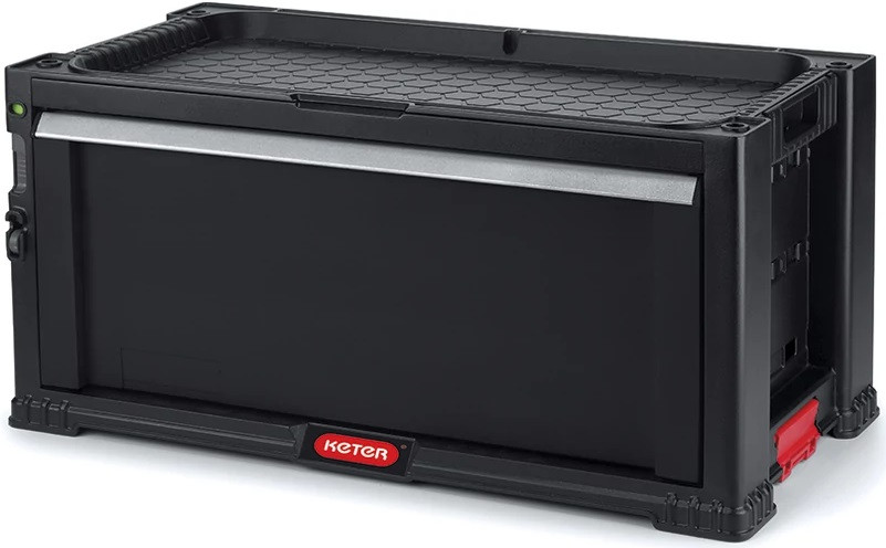 A moduláris felépítésű, sokoldalú fiókos láda a retesznek és a zárszerkezetnek köszönhetően más egységekkel is egymásra rögzíthető.